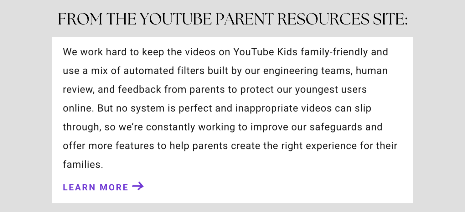 2) YouTube uses a mix of AI, human review and parental feedback to filter out inappropriate content. YouTube admits that it’s not a foolproof system.